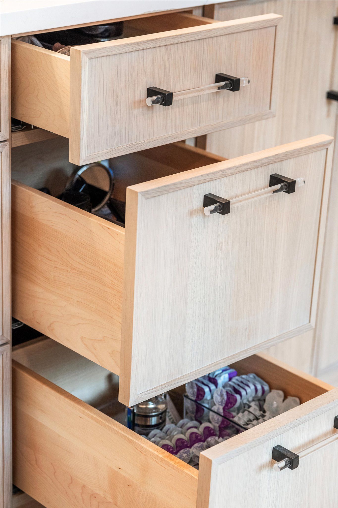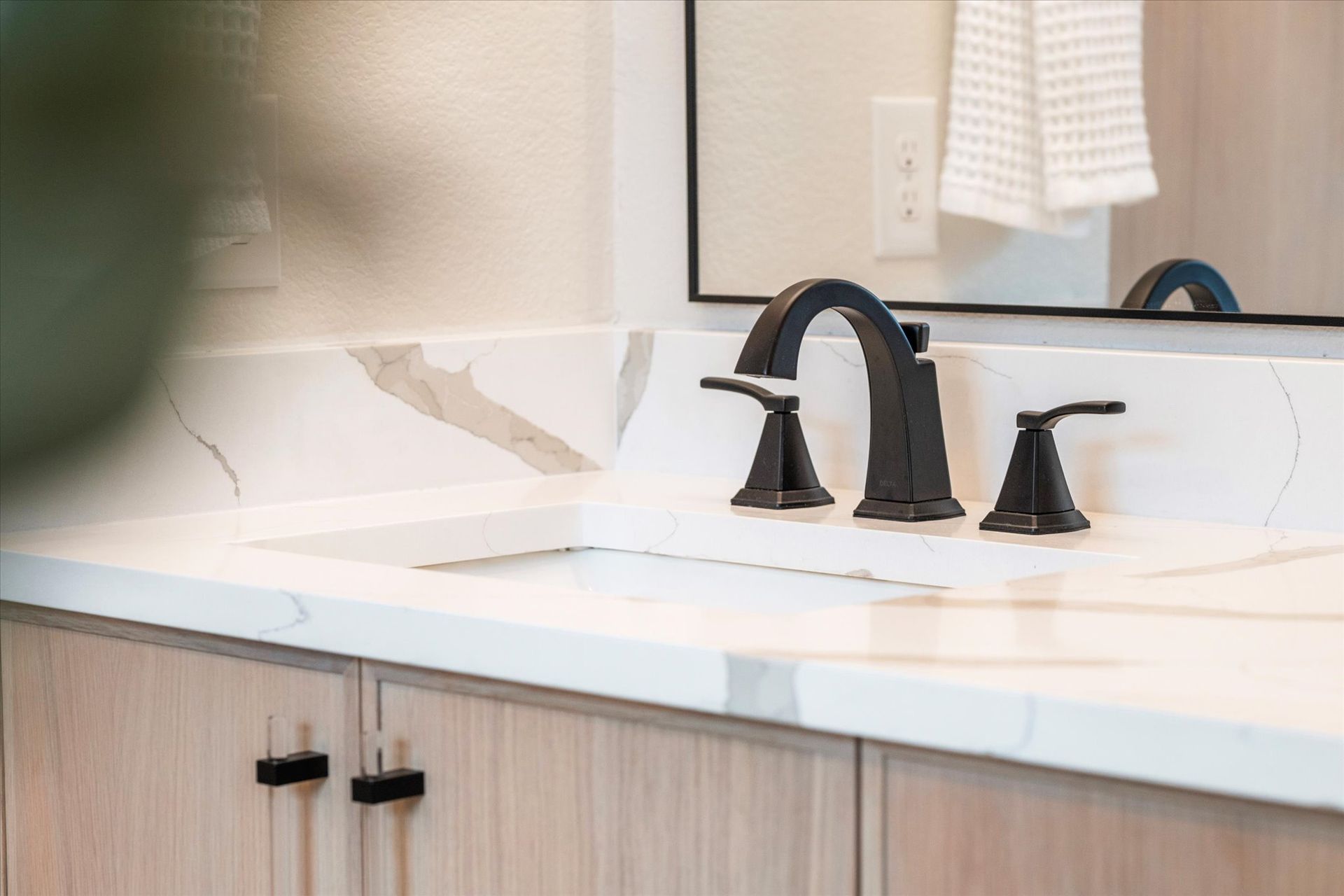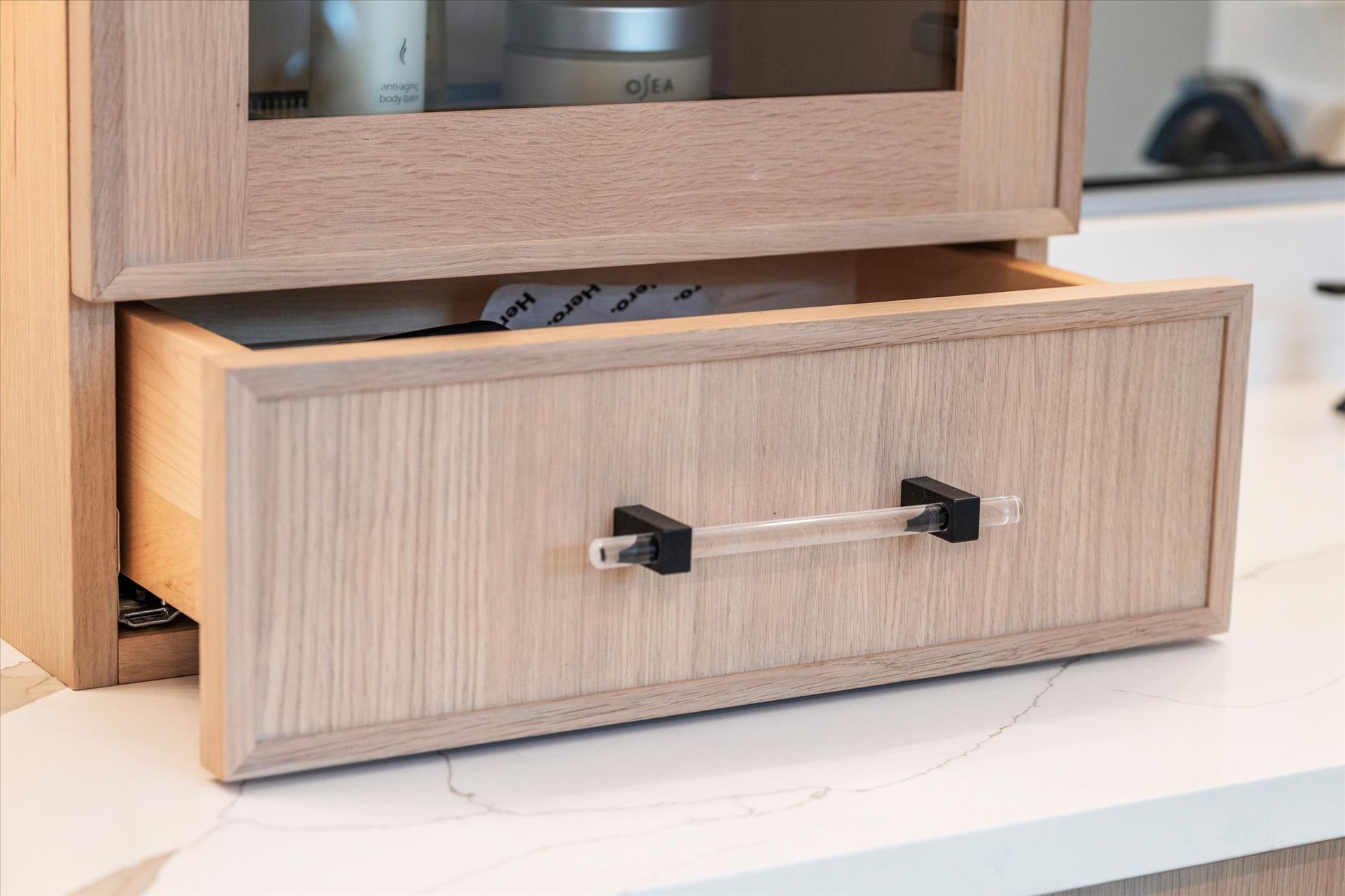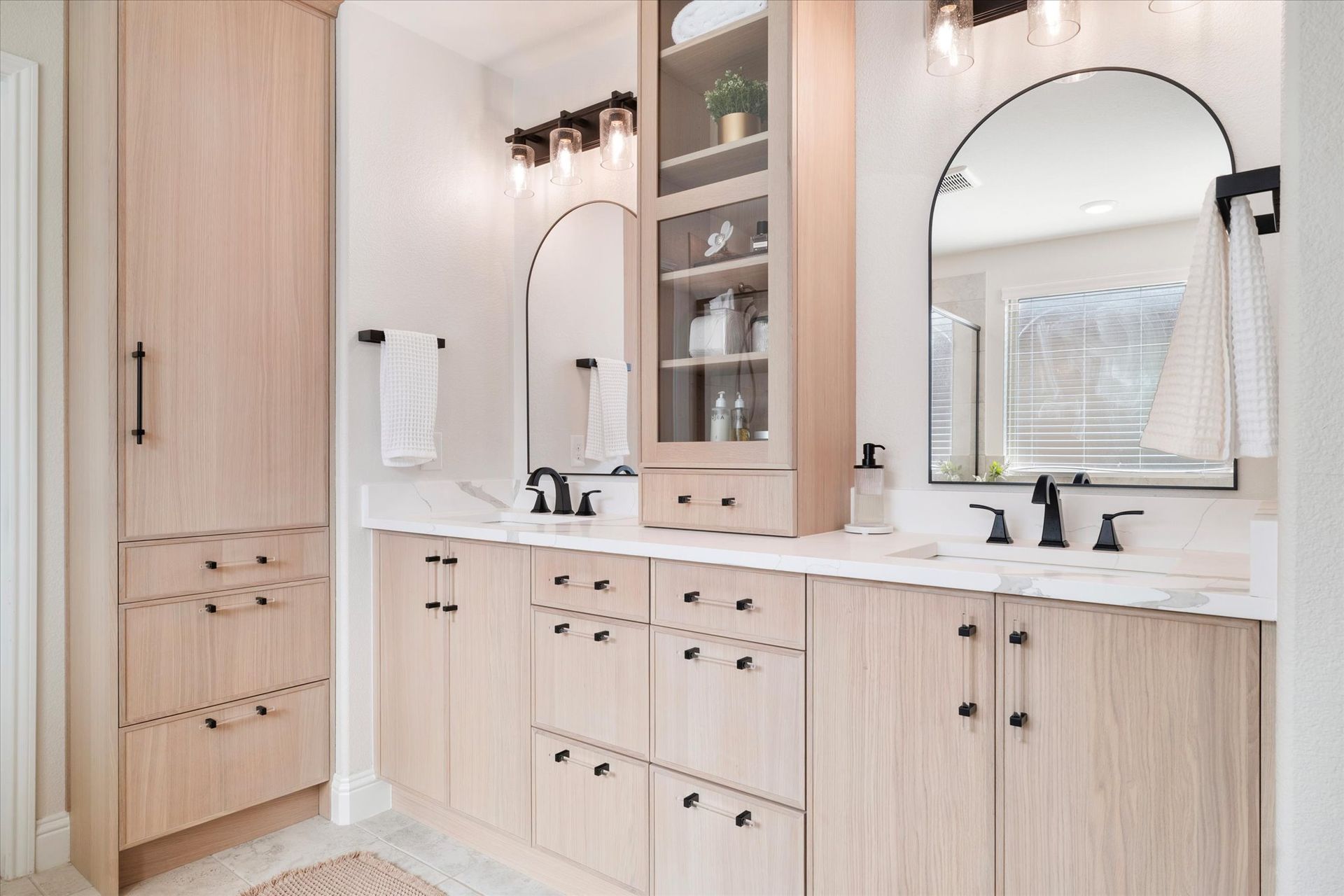 Our clients envisioned a modern transformation for their home, focusing on a refreshed primary bathroom and an expanded kitchen. The primary bathroom features a stunning vanity crafted from rift white oak wood, bringing natural warmth and elegance to the design. In the kitchen, we extended the space to harmonize with their existing cabinetry, creating a cohesive and practical layout.